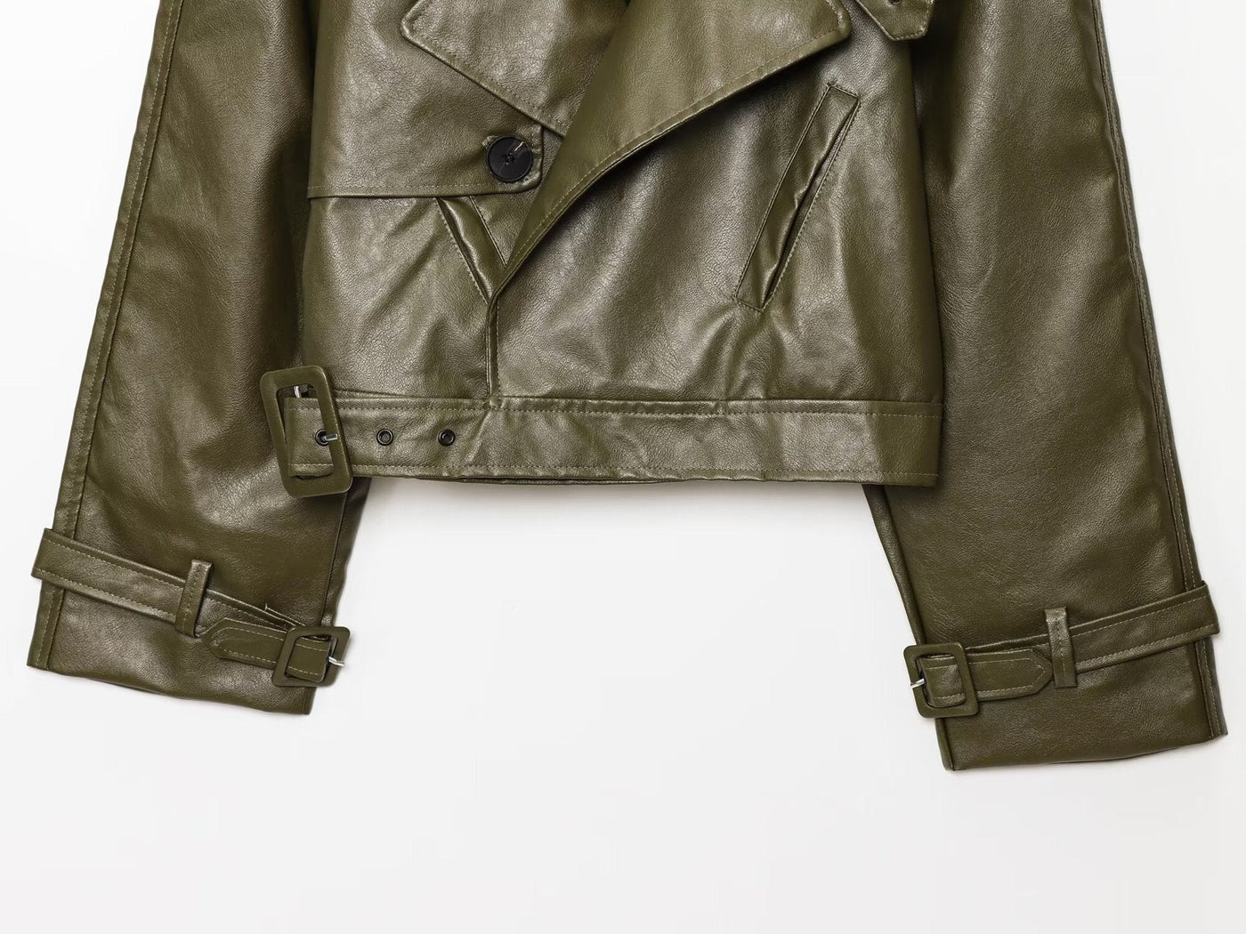 Diese kurze Damen-Motorradjacke aus hochwertigem PU-Leder vereint rockigen Biker-Style mit urbanem Chic. Der taillierte Schnitt und die langen Ärmel sorgen für eine schmeichelnde Passform, während die satte grüne Farbe dem Look eine einzigartige, trendige Note verleiht.