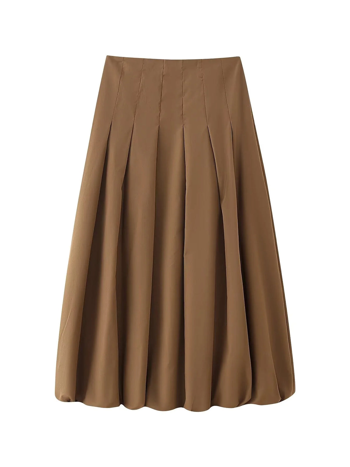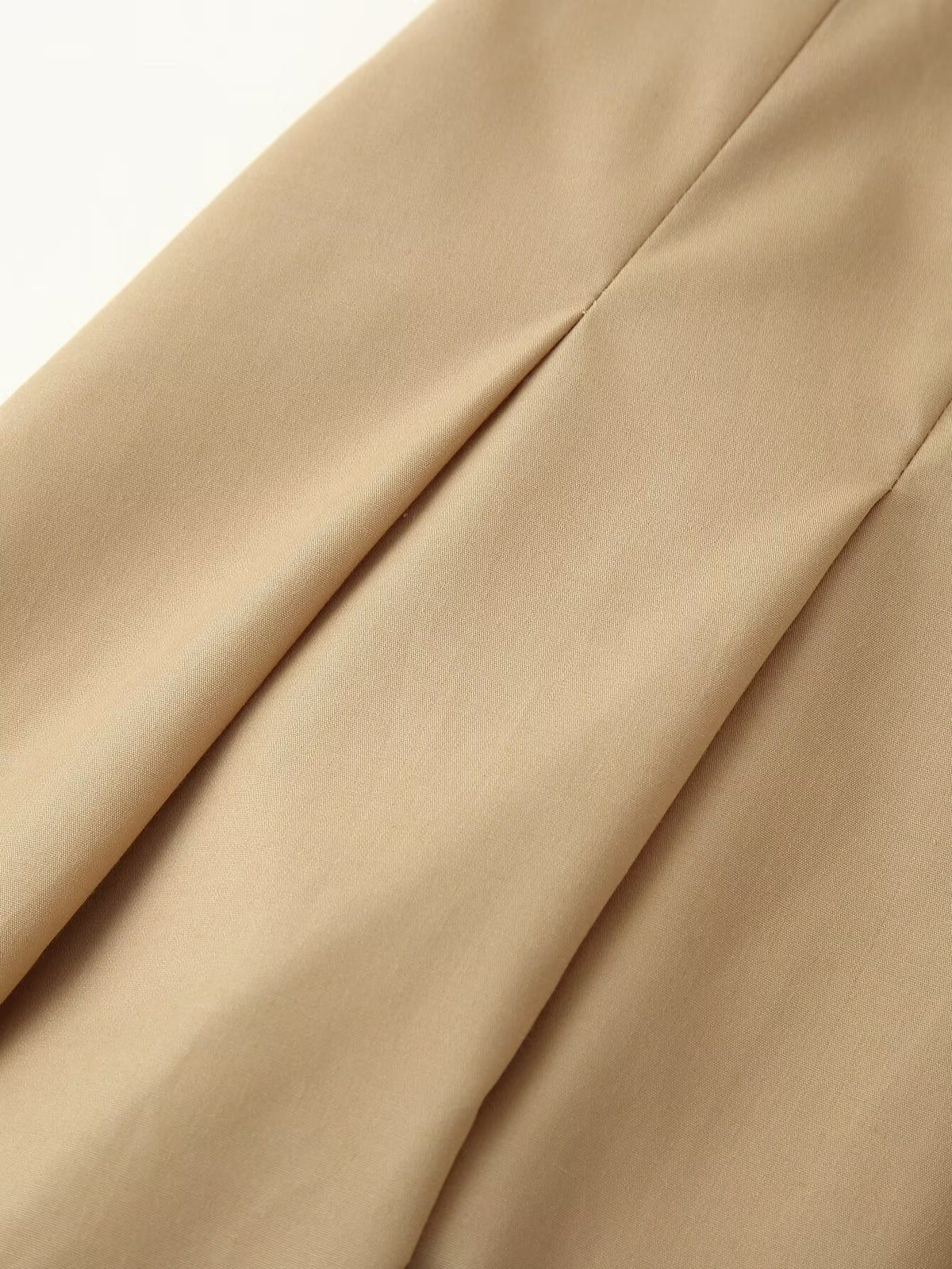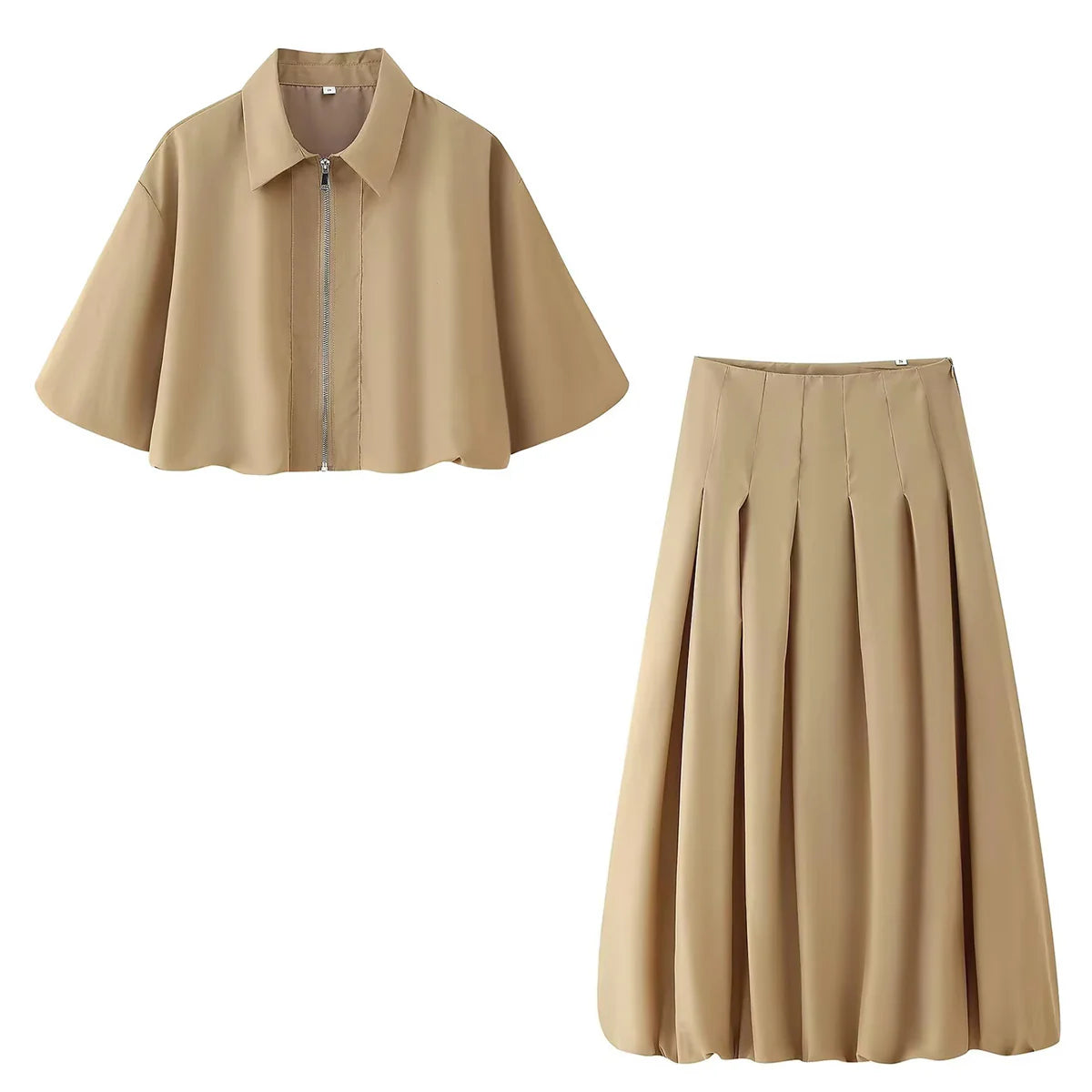 Das zeitlose Design in den Farben Beige und Braun macht das Outfit zu einem vielseitigen Allrounder für Büro, Freizeit oder besondere Anlässe. Der Mantel verleiht einen edlen Look, während der Plisseerock mit hoher Taille für eine feminine Silhouette sorgt.