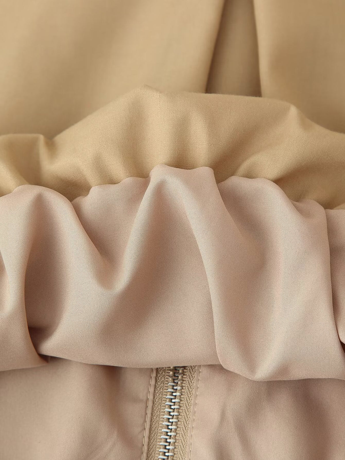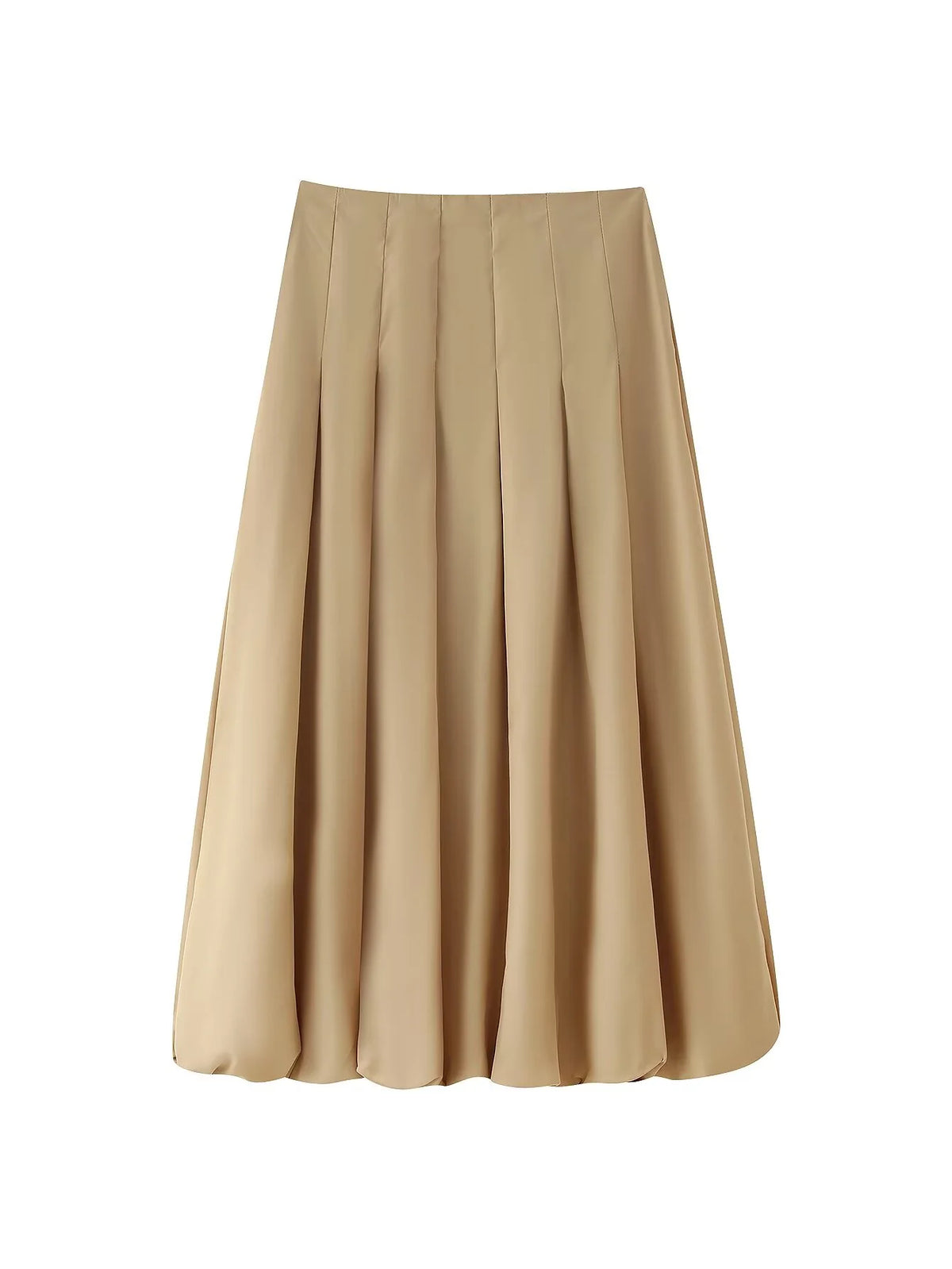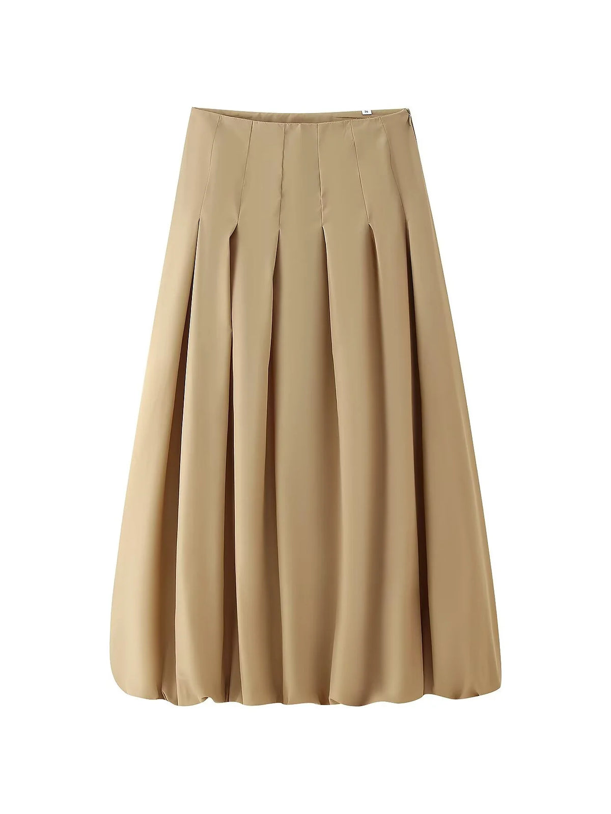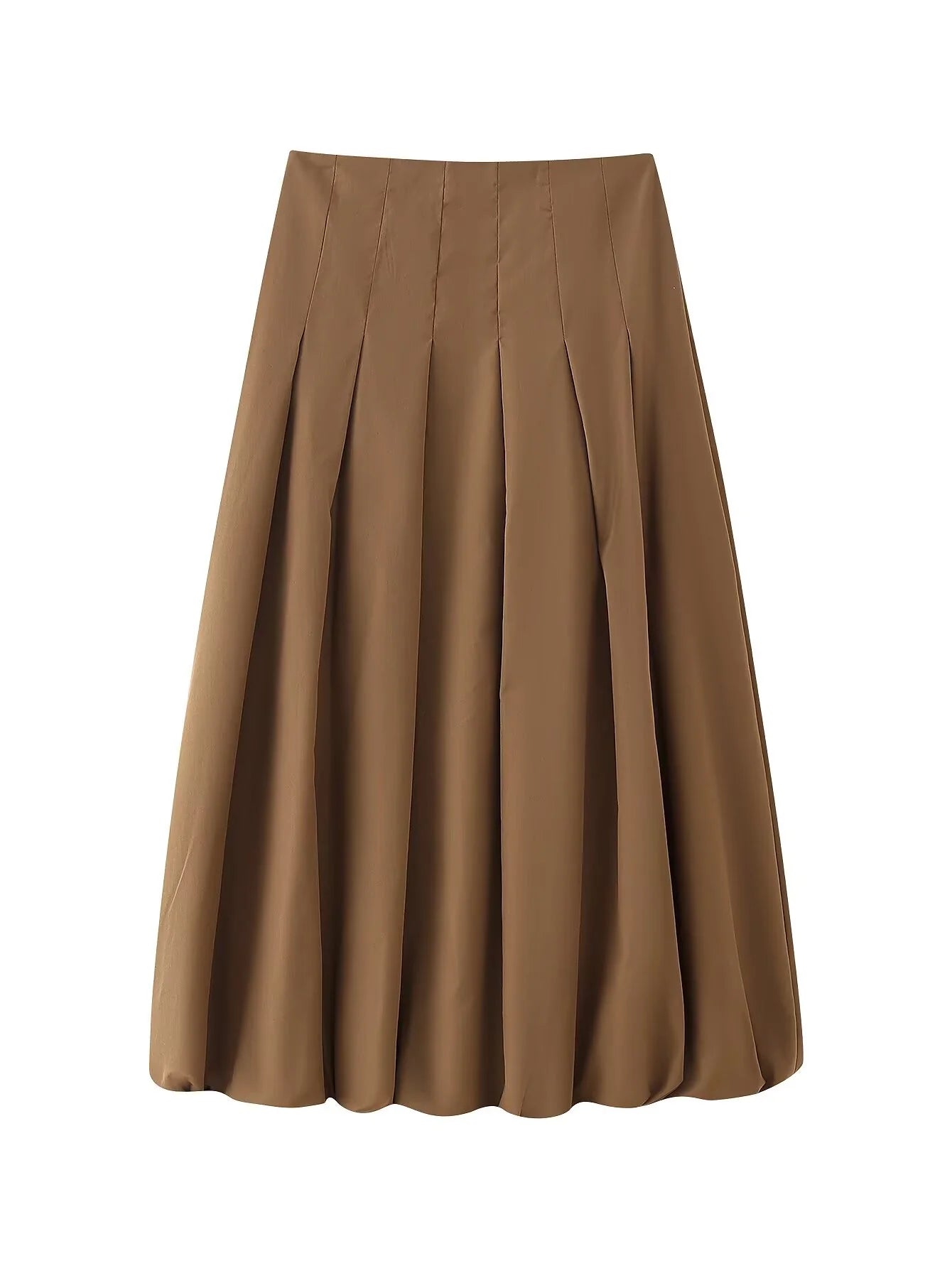 Das zeitlose Design in den Farben Beige und Braun macht das Outfit zu einem vielseitigen Allrounder für Büro, Freizeit oder besondere Anlässe. Der Mantel verleiht einen edlen Look, während der Plisseerock mit hoher Taille für eine feminine Silhouette sorgt.