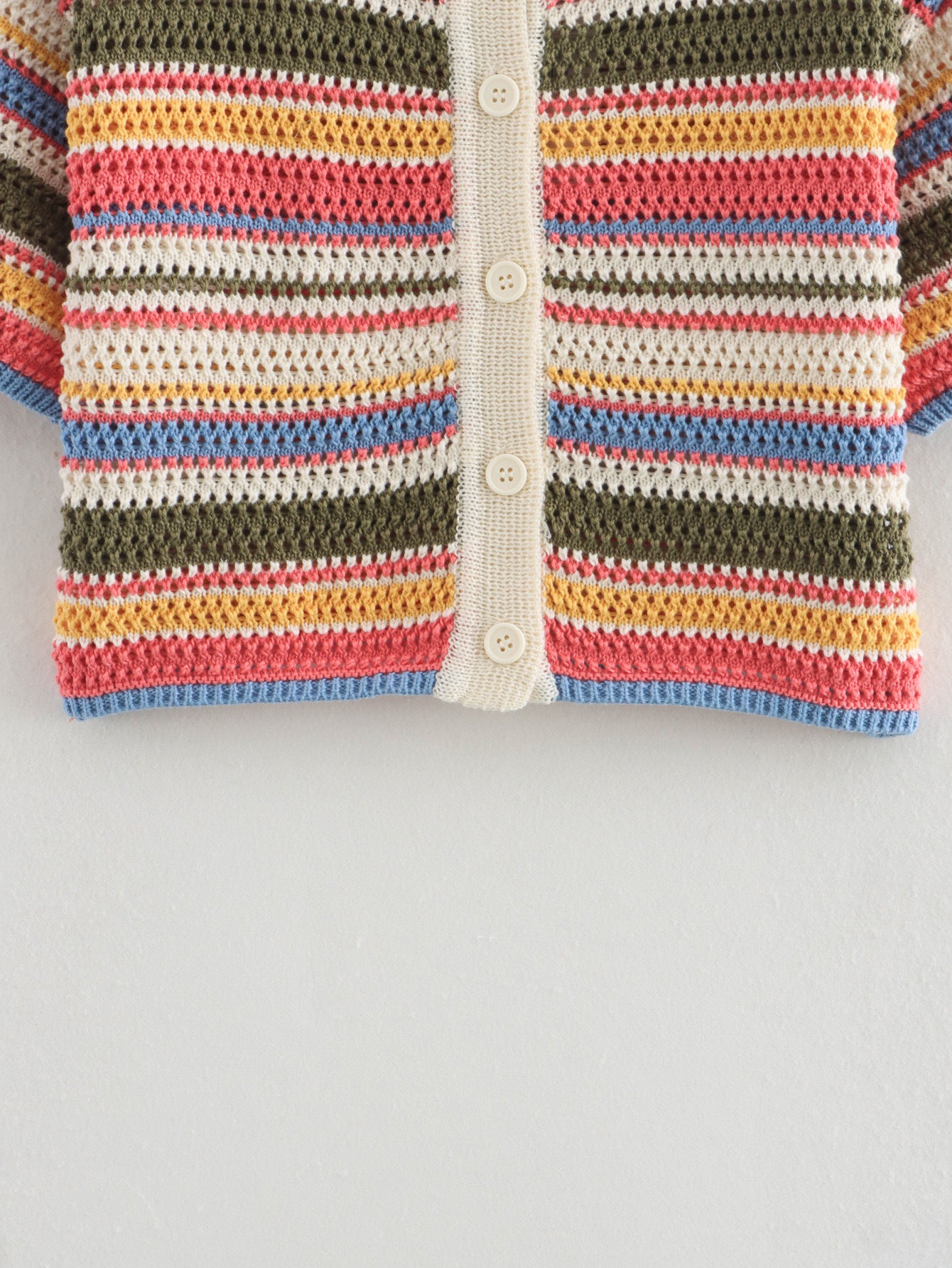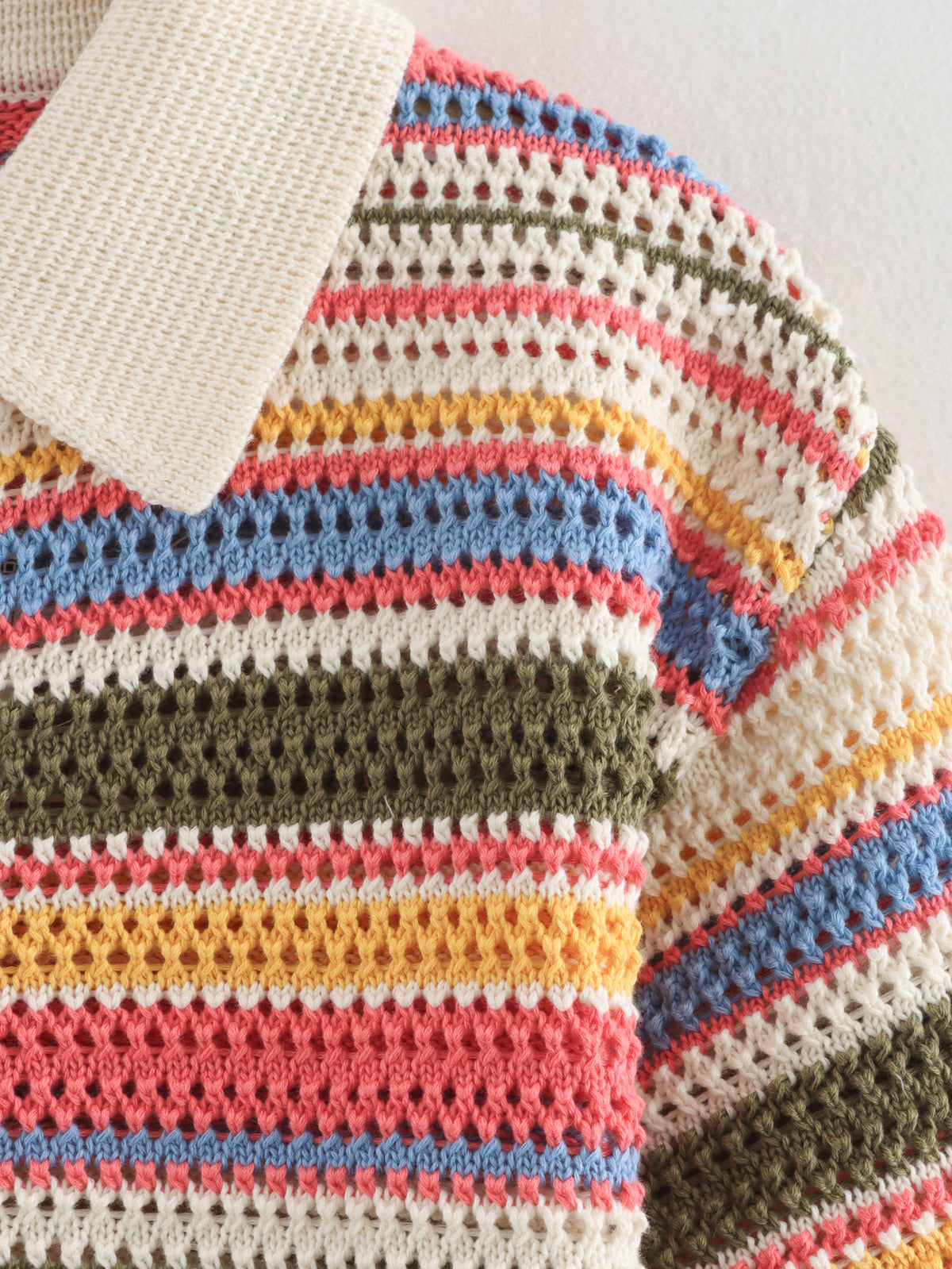 Beschreibung: Bringen Sie gute Laune in Ihre Sommergarderobe mit unserem lebhaften gestreiften Strickset! Dieses charmante zweiteilige Ensemble besteht aus einem kurzärmeligen Polo-Top und passenden Shorts, die mit einem verspielten horizontalen Streifenmuster in einer Palette von sommerlichen Farben (Pink, Orange, Blau, Weiß und mehr) verziert sind. Das Polo-Top mit Kragen und kurzer Knopfleiste bietet einen lässigen, aber dennoch gepflegten Look. Die dazu passenden Shorts mit elastischem Bund sorgen für optimalen Komfort und Bewegungsfreiheit. Gefertigt aus einem angenehmen Strickmaterial, ist dieses Set ideal für entspannte Tage, sommerliche Ausflüge oder einfach zum Wohlfühlen mit Stil.
